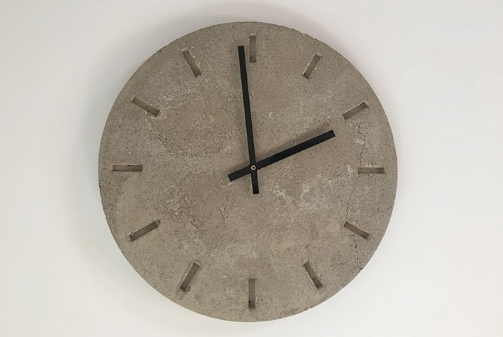 A quick and minimal project, the concrete clock was built as a house warming gift for my brother. It is comprised of just a clock mechanism and a concrete face with recesses marking hour divisions.