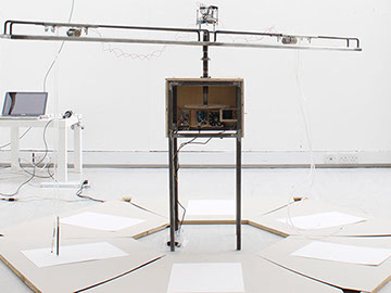 The over-arching 'Explorations' title of the course is intended to encourage unusual, inventive ways of approaching a design brief. With this in mind I endeavored to construct a responsive machine through which my proposal could be informed. The drawing machine was able to respond to a number of inputs: colour tracking; audio; bluetooth mobile application.